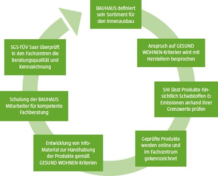 Sobald ein Produkt alle Prüfungen erfolgreich durchlaufen hat, wird es in unser GESUND WOHNEN-Sortiment aufgenommen und für Sie ganz einfach erkennbar gemacht. Im BAUHAUS Onlineshop finden Sie die geprüften Produkte mit einer speziellen Kennzeichnung versehen und können sie gezielt suchen. In unseren Fachcentren sind sie plakativ durch grüne Preisetiketten und Regalkennzeichnungen erkennbar, sodass Sie sich ganz einfach für emissions- und schadstoffarme Produkte entscheiden können.